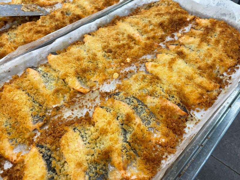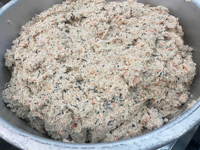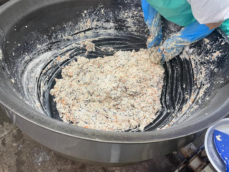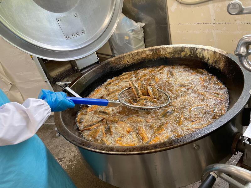 ↑船橋産のスズキを切り身に加工するとき廃棄していたしっぽや中骨を使用