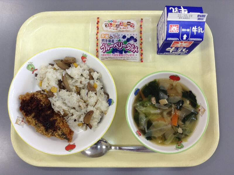 ごぼうピラフ 鮭の青のりフライ キャベツとベーコンのスープ ブルーベリータルト