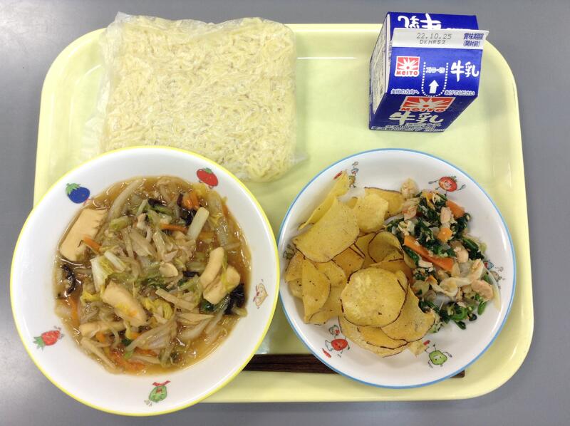 あんかけ焼きそば ほうれん草とツナの和え物 さつまチップ