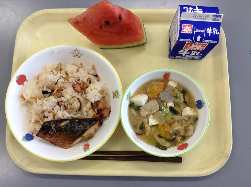 たこ飯 鯖のピリ辛焼き 豚汁 スイカ