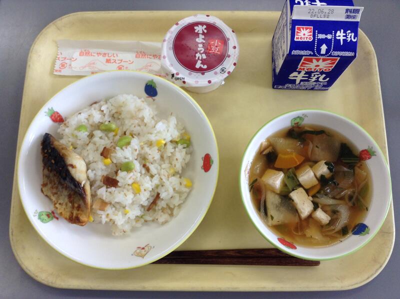 枝豆とコーンのごはん 鯖のごまだれ焼き 冬瓜汁 水ようかん