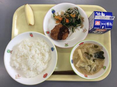 ご飯 おからコロッケ ほうれん草の胡麻和え 春野菜の味噌汁 りんご 牛乳