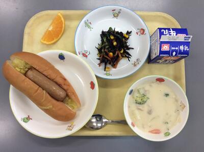 ホットドッグ ひじきのマリネ ホワイトシチュー オレンジ 牛乳