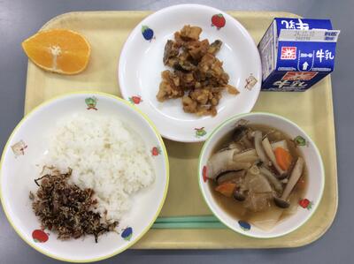 たけのこご飯、メバルの竜田揚げ、生揚げの味噌煮、りんご、牛乳