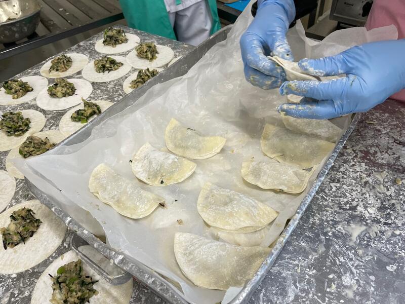 キムチご飯 小松菜ぎょうざ 中華コーンスープ りんご