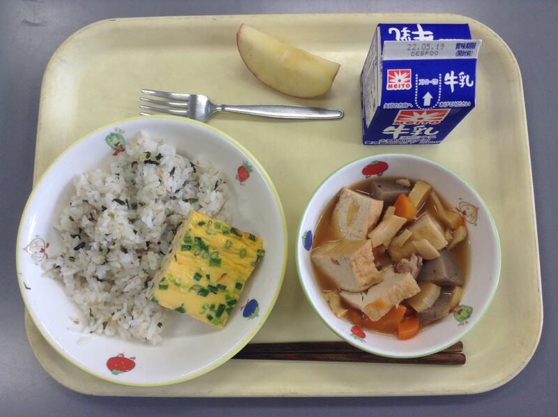 五穀ご飯 千草焼き たけのこと生揚げの煮物 りんご