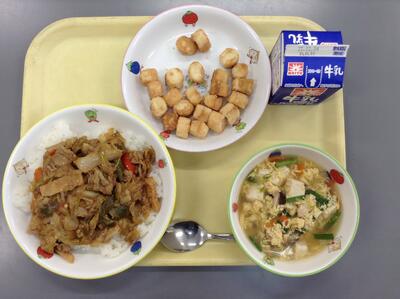ご飯 はたはたの竜田揚げ バンサンスー 麻婆豆腐 花みかん 牛乳