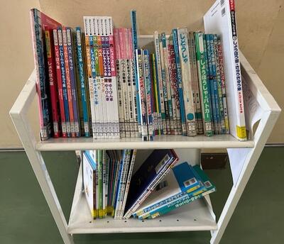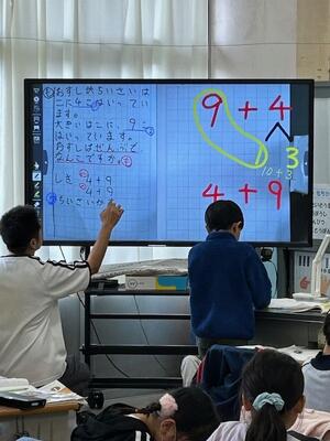 1年生の算数は、『10より大きな数』をやっています。大型提示装置にノートを映したり直接書き込んだりしています。隣のクラスは、国語で『はたらくじどうしゃ』の勉強中。廊下には、個々が課題を持って調べられるように、関係する図書資料が準備されています。自校の図書室のものもあれば、公共図書館から借りたものもあるのです。