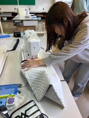 6年生は家庭科室でナップザックづくり。ミシンの使い方にも慣れたもので、紐通しの部分を上手に縫っています。ミシンは2人に1台の割合ですので、作業が重なってしまうと、どうしても待ち時間が発生してしまうのです。