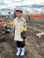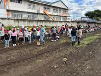 昨日の雨が上がって、いい感じに湿った畑。先週、雨で延期になったサツマイモ掘りを行いました。ファーマーズの皆さんや保護者ボランティア、PTA役員の方の協力の下で、収穫は昨年以上で大豊作!ありがとうの言葉より、子供たちの笑顔が一番の感謝の気持ちの表れかもしれません。