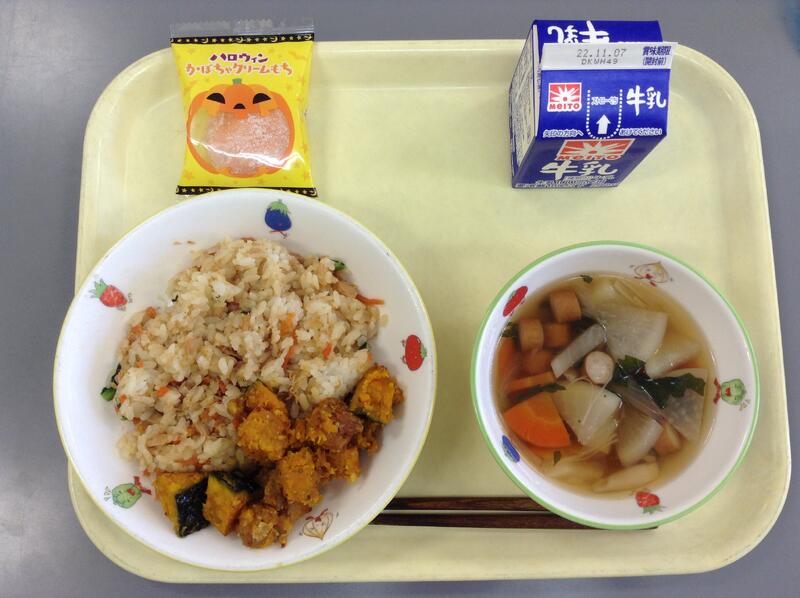 さつまいもと栗のご飯 魚のきのこあんかけ かぶと油揚げの味噌汁 りんごゼリー