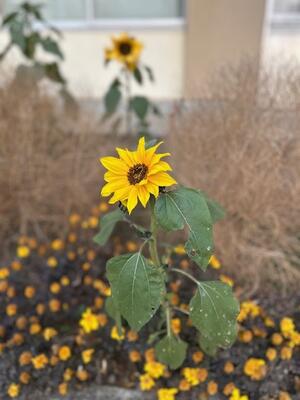 寒い朝、体育館寄り校庭側花壇に咲くひまわり。まだつぼみのものもあって応援したくなります。