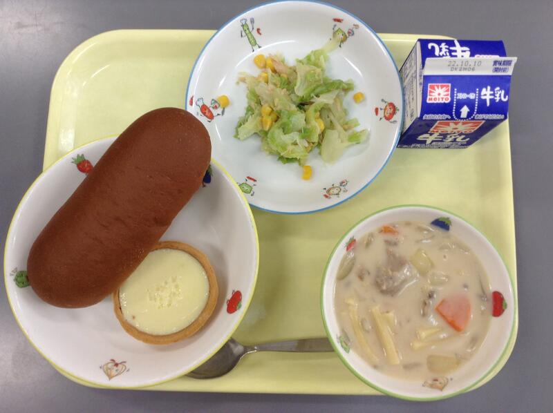 黒糖パン キャベツとコーンのサラダ マカロニのクリーム煮 梨のタルト