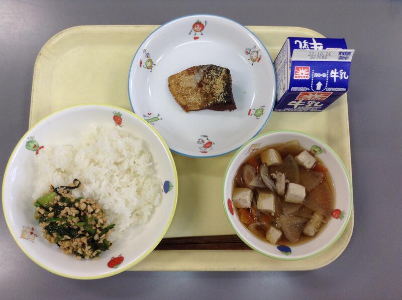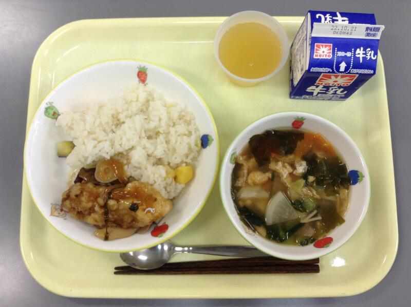 さつまいもと栗のご飯 魚のきのこあんかけ かぶと油揚げの味噌汁 りんごゼリー