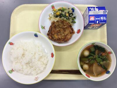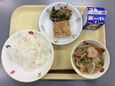 ご飯 大豆のかき揚げ 小松菜の和風サラダ 白玉雑煮 牛乳
