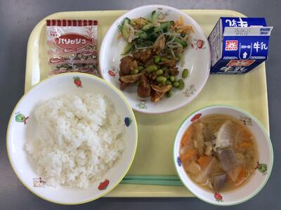 枝豆ご飯 いわしバーグ 胡麻酢和え 雷汁 青梅ゼリー 牛乳