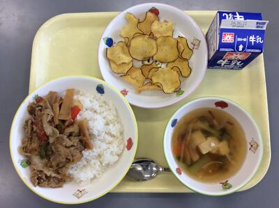 麦ごはん 回鍋肉丼 さつまチップ 青梗菜とベーコンの中華スープ 牛乳