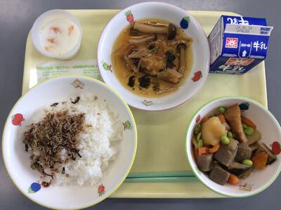 ご飯 チキンチキンごぼう もやしのカレー和え 呉汁 小魚 牛乳