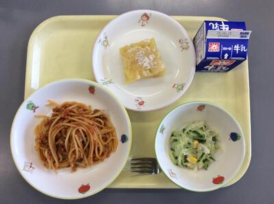 スパゲティボロネーゼ コールスローサラダ パイナップルケーキ 牛乳