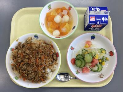 ご飯 ドライカレー フレンチサラダ フルーツ白玉ポンチ 牛乳