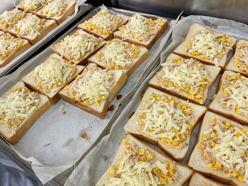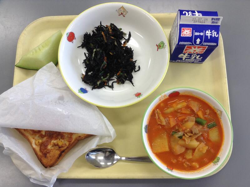 ツナマヨコーントースト ひじきのマリネ ポークビーンズ メロン