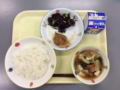 ご飯 鱈のおろしソースがけ ひじきの炒め煮 ちゃんこ汁 牛乳