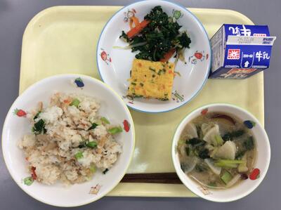 五色ご飯 擬製豆腐 ほうれん草の胡麻和え 栄養味噌汁 牛乳