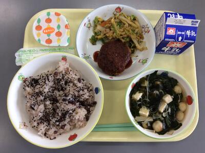 赤飯 キャベツメンチ 白菜のおかか和え すまし汁 フローズンゼリー(夢オレンジ) 牛乳