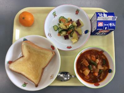 はちみつレモントースト さつまいもサラダ ポークビーンズ 冷凍みかん 牛乳
