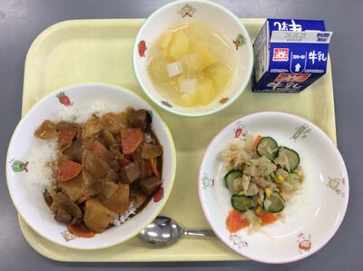 ご飯 カレー コーンサラダ 秋のフルーツポンチ 牛乳