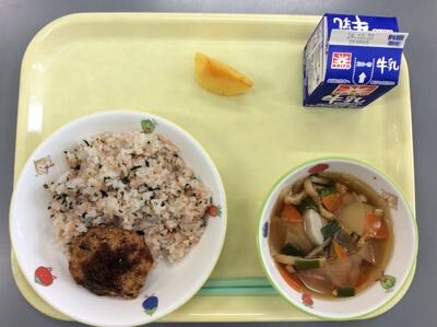 ご飯 エコふりかけ おからハンバーグ さつま汁 りんご 牛乳