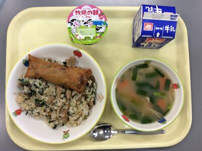 ビビンバ 五目春巻き トックスープ いちごヨーグルト 牛乳