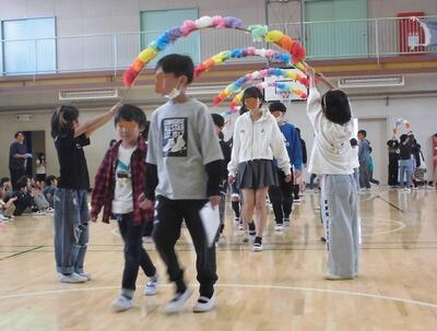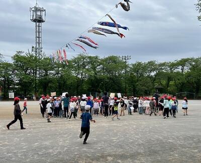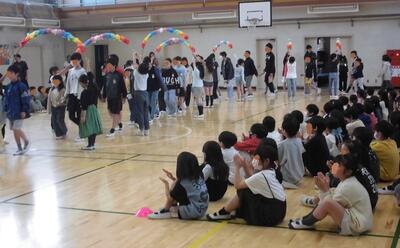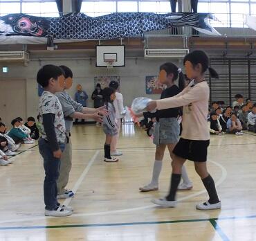 今日は、1年生を迎える会のあと全校で姥山貝塚への遠足でしたが、午前中に雨が降り出す予報。急遽、1,2時間目に交流学年での遊びを入れて、その後に迎える会というように順番を変更しました。貝塚へ行って急な雨降りに遭うと着替えがないので、校庭や体育館などでの活動にします。お弁当は、交流グループで食べます。