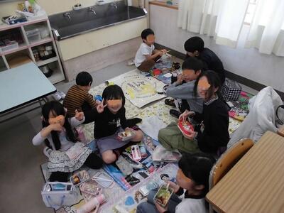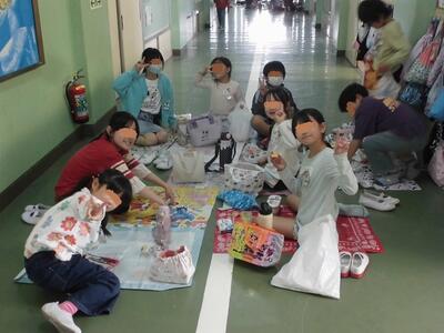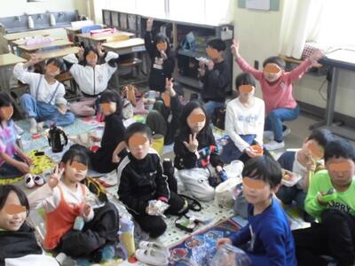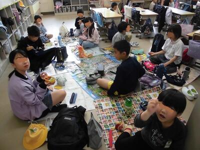 今日はお弁当の日!交流学級が二手に分かれて、教室や廊下にレジャーシートを敷いていただきます。どの子もいい顔をしています。明日からの連休も楽しんでね。