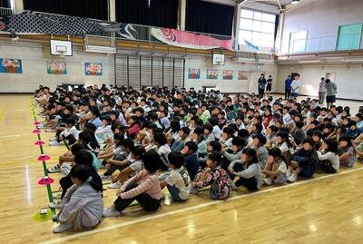 5月初日、芍薬が見事に花開きました。その脇で四つ葉を探していた児童から、プレゼントしてもらってうれしさ倍増。そして、全校348名が初めて揃って、体育館で朝会を行いました。今日の話は、「おもいやい算」について。