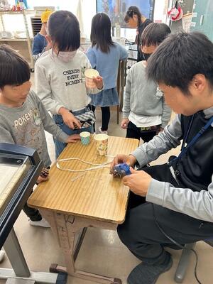 1年生が、ドングリや松ぼっくりなどの秋の実を使っておもちゃ作りをしています。先生は、ヒートガンを使って接着のお手伝いです。マラカスやペンダント、迷路、剣玉など、アイディアの宝庫です。