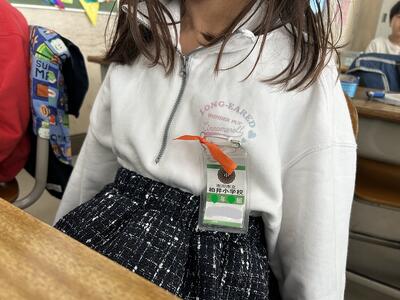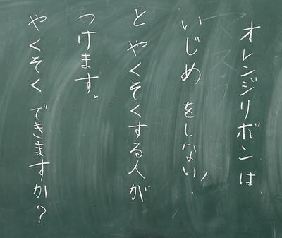 代表委員を中心に、「いじめ防止運動」を展開しています。1年生の名札に、6年生がオレンジリボンを結んであげていました。各学級で標語を考えたり、道徳の授業で一緒に考えたりもします。