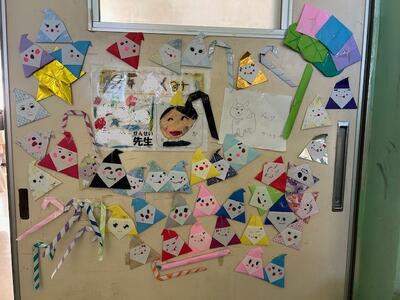 2年生の教室扉は、クリスマス飾りでいっぱいです。子供たちが自主的に折り紙で作っては貼っています。先生の似顔絵の髪の毛に黒い杖がついて、お内裏様みたいに…。