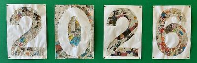 5年生の廊下壁面に、「2026 うま年」という大きな文字があります。新聞をちぎって貼り絵にした作品です。ゼロの真ん中に2026を配置するなんてオシャレ!!