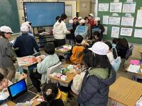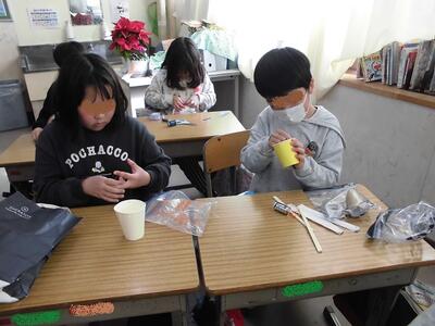 2年生は、図工でおもちゃ作りを始めたようです。紙コップや割りばし、糸、乾電池など思い思いの道具を持ち寄っています。タブレットで何を作ろうかヒントを得ている子もいます。