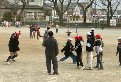 3学期の休み時間は、校庭で長縄跳びをするクラスや集団がいっぱいです。決められた時間の中でどれだけ跳べるか、記録の上書きを目指しますが、そのために声をかけ合ったり教え合ったりしていきます。