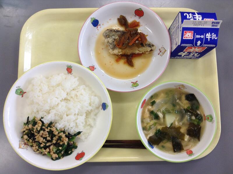 五穀ご飯 千草焼き たけのこと生揚げの煮物 りんご