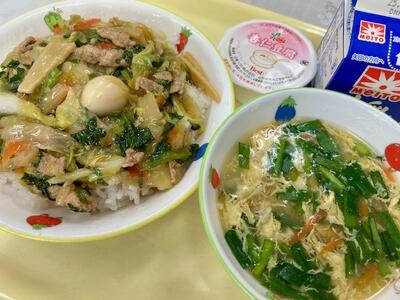 白菜と豚肉のあんかけ丼(麦ごはん)、ニラ玉スープ、杏仁豆腐、牛乳