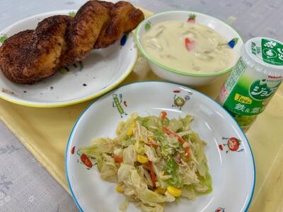 ココア揚げパン、ホワイトシチュー、キャベツとコーンのサラダ、ジョア(マスカット味)