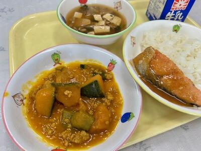 ごはん、鮭の柚子味噌がけ、かぼちゃのそぼろ煮、みぞれ汁、牛乳
