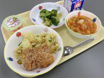 カレーピラフ 鶏のから揚げ ブロッコリーサラダ ミネストローネ クリスマスデザート 牛乳