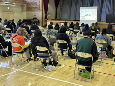 入学までの準備や保健、給食などについて、寒い中聴いていただいています。