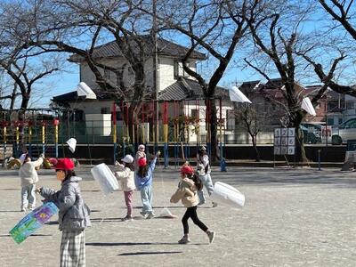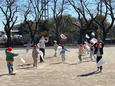 校庭では、1年生が凧揚げを始めました。思い思いの絵や色で描かれた凧を、最初は引っ張って走っていましたが、教わると適度な風に乗って高くあがっていきます。