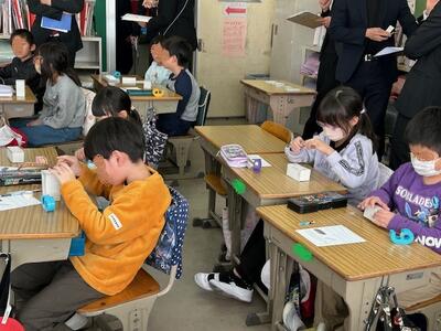今日は、今年度最後の算数の授業研究会。2年生と4年生での展開です。まずは4時間目の2年生。こちらは「はこの形」の学習でした。