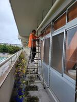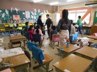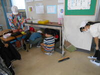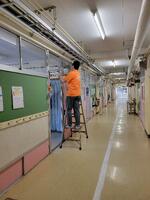 教室の壁や床、机の上をきれいにしたり、掲示物をはがしたり。